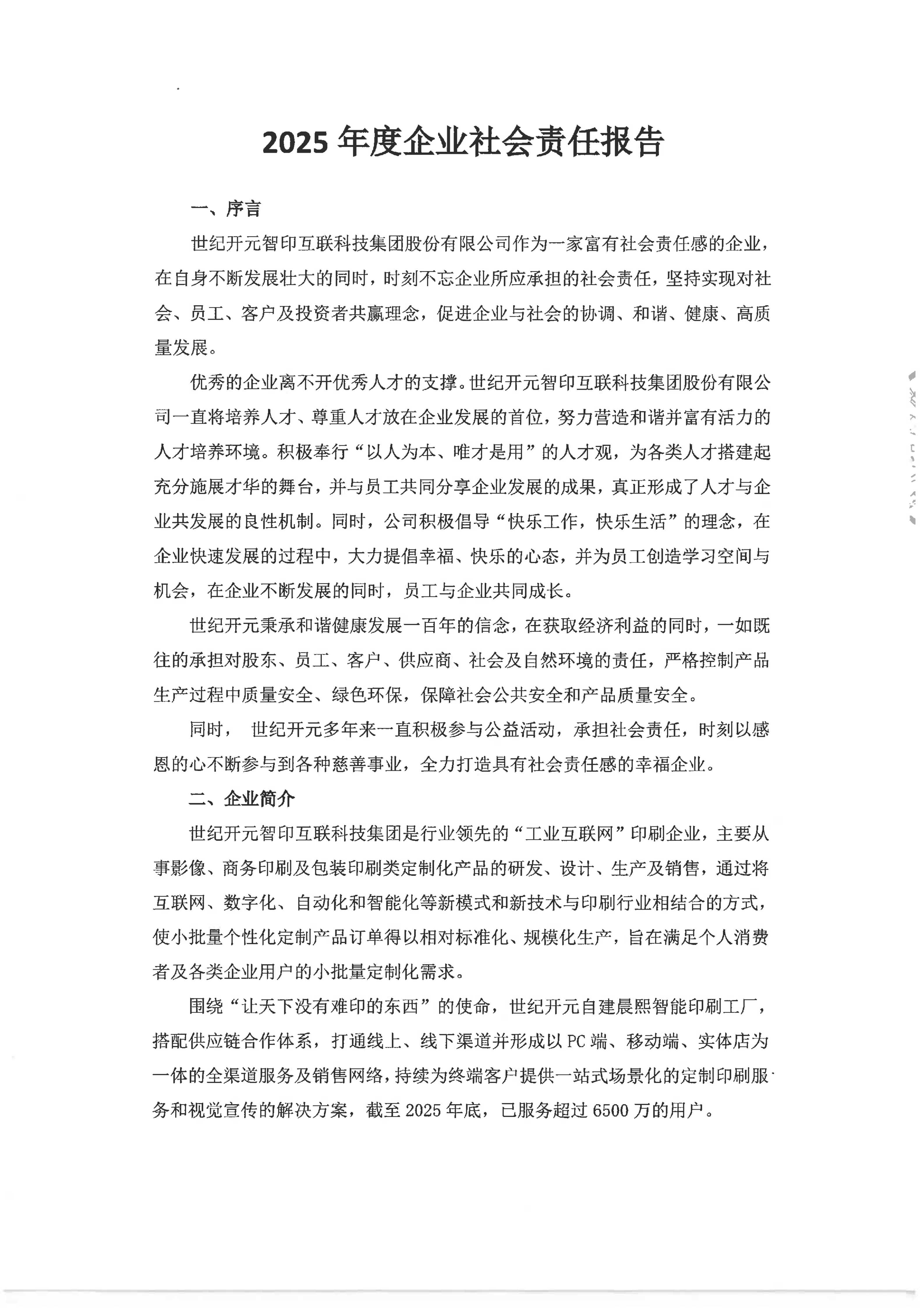 世纪开元总部位于山东济南,拥有世纪开元文化创意产业园和晨熙智能生产园区两大园区,员工2000人,是行业领先的“工业互联网”印刷企业,主要从事影像定制、商务印刷、商务包装、食品包装、精品包装、文创产品、企业定制、广告图文等产品的研发、设计、生产及销售,以技术创新为核心,实现互联网与传统印刷行业的深度融合,满足各类企业用户及个人消费者的小批量定制化需求,为客户提供一站式、场景化定制服务。截至2024年底,累计服务用户已达6000万。